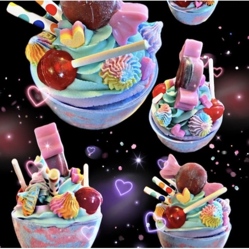 This bath bomb gives you 10 oz of goodness! It comes with bubble frosting topped with 2 MP glycerin soap lollipops, a MP glycerin soap piece of candy, bubble frosting candy tops, and bubble bar heart decorations. The bottom contains a foaming bubble bath bomb. Made with high quality Non GMO ingredients so no need to worry about irritants. It will be heat sealed to preserve freshness. Please leave your fragrance choice in the personalization section.