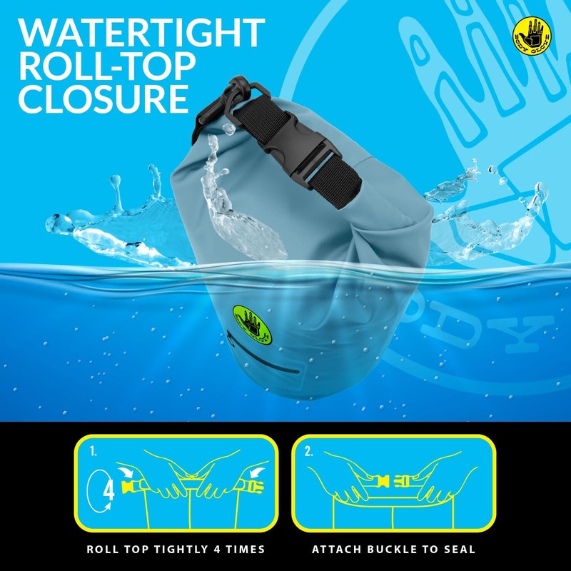 - BLUE DRY BAG: A light gray dry sack with black Body Glove logo and a yellow zipper pull for a touch of contrast. This stuff sack looks at home on the hiking trail and on the train home from work