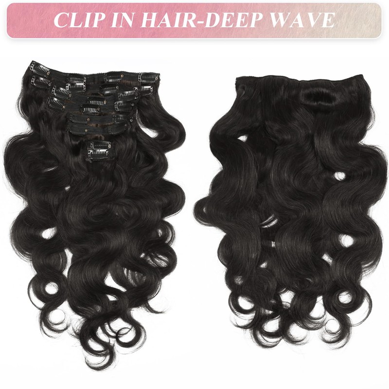Body Wave Clip-In Real Hair Extensions, 8 Pieces, 120 g, Wet and Wavy Clip-In Full Head, Seamless Remy Hair Extensions for Women, Double Wefts, Natural Black, 22 Inches, 55 cm