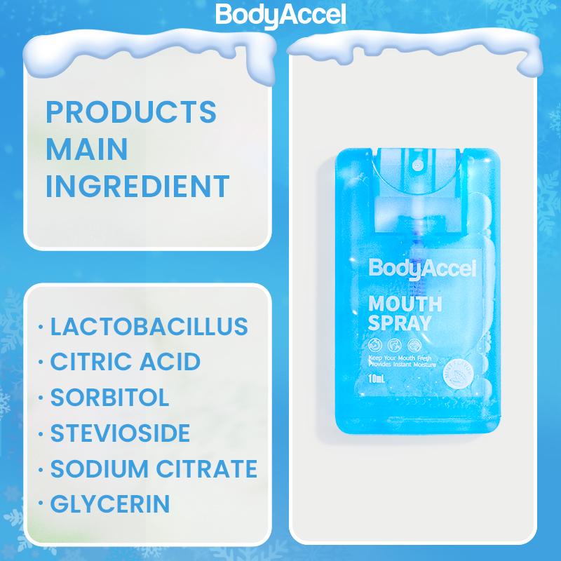 PROMOTES ORAL HEALTH - BodyAccel Fresh Mint Flavored Mouth Spray is a great way to keep your breath fresh while on the go. Enriched with botanical extracts as well as Lactobacillus to protect the oral mucosa and regulate the balance of flora, it fights odor-causing bacteria and hydrates gums, leaving your mouth cleaner and fresher with every spritz.