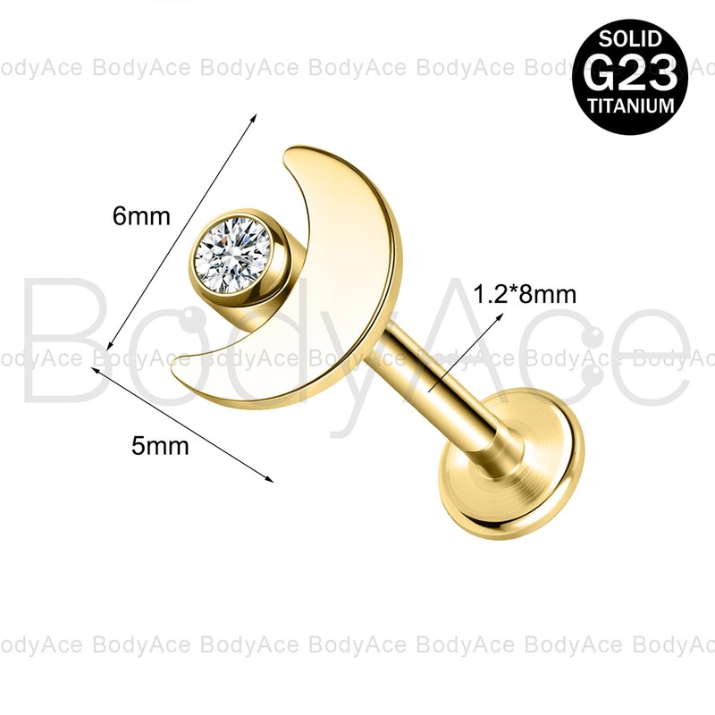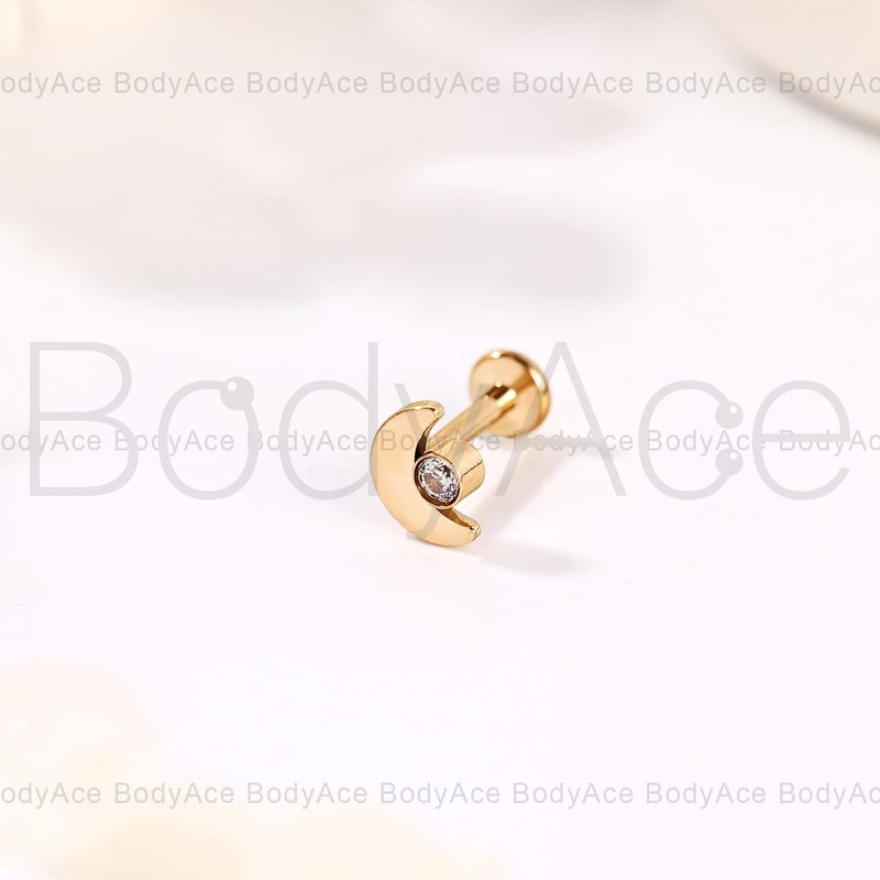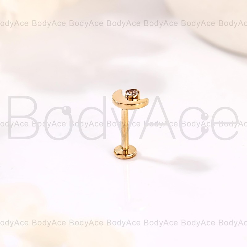 BodyAce Gold ASTM F136 Titanium Lip Bars, 16G Flat Back Earrings with Piercing Taper, Internally Threaded Labret Ring Cartilage Piercing Tragus Studs [Gold Moon White Zircon]