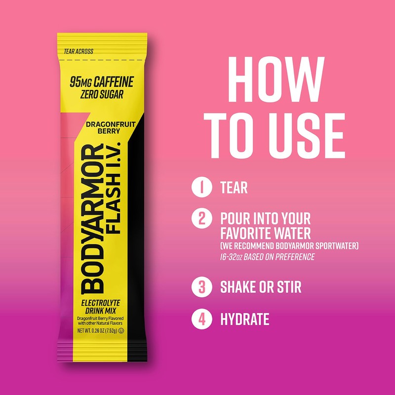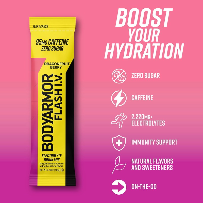 BODYARMOR Flash I.V. Caffeine Hydration Booster Dragonfruit Berry is a hydrating electrolyte drink mix with potassium and natural flavors to help you stay hydrated and energized. This electrolyte drink mix pouch provides essential electrolytes and 95mg of Caffeine without artificial sweeteners, flavors or dyes for hardworking hydration. BODYARMOR combines electrolytes, caffeine, antioxidants & vitamins to help keep you going when you get thirsty. The refreshing dragonfruit berry burst provides a bright fruitiness in every sip, taking your hydration to the next level. Whether you're traveling, on-the-go, or training, you can take your hydration and energy with you with BODYARMOR Flash I.V. Caffeine Hydration Booster Dragonfruit Berry.