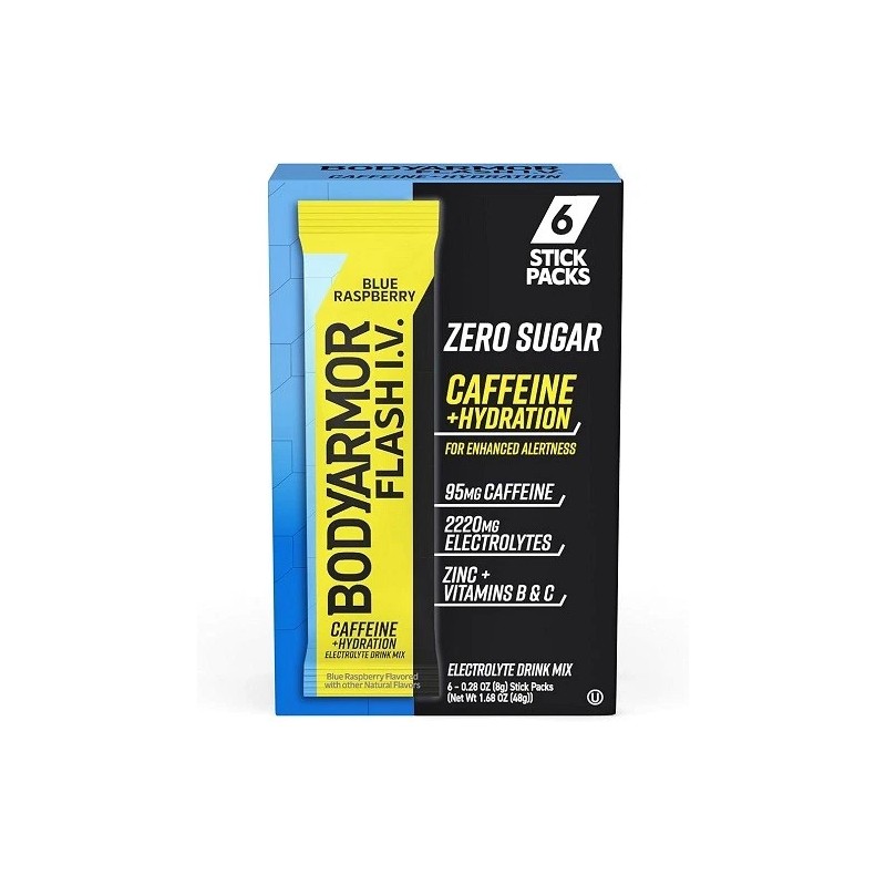 Bodyarmor Flash I.V. Caffeine + Hydration Zero Sugar Blue Raspberry 6 - 0.28 oz Packets 1.68 oz Box Expiration Date Always Fresh 95 mg Caffeine Scientifically formulated for superior hydration than water alone. Vegan, soy free, dairy free, gluten free. |