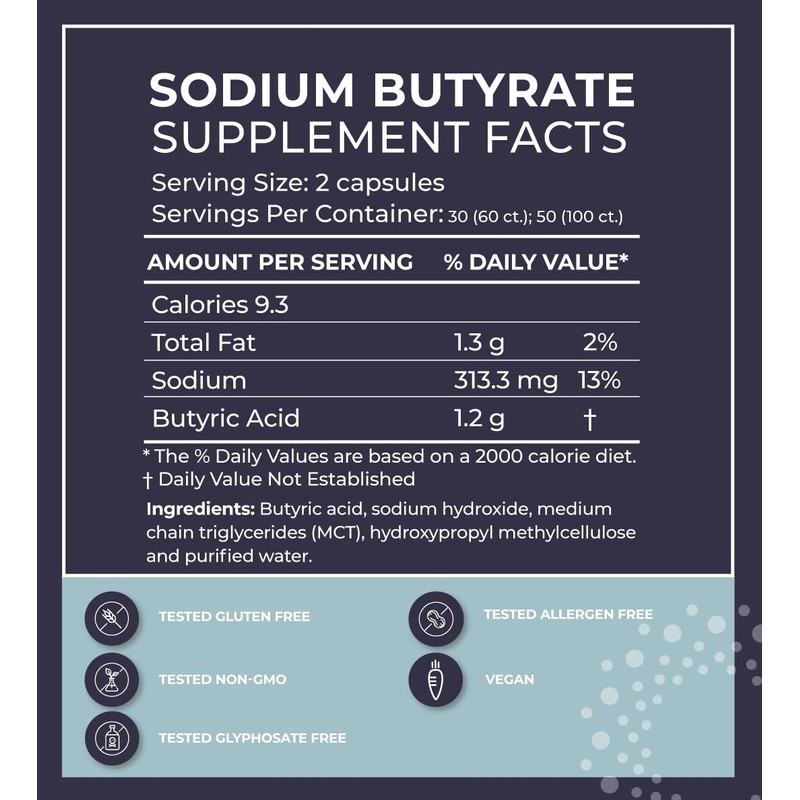 - Improves Gut Health: Butyrate is a short chain fatty acid produced in the colon. It supports the formation of friendly bacteria that enhances probiotics to help promote digestive health*. It is unlikely that you get enough butyrate from your food sources to be physiologically beneficial, making butyrate supplementation a prudent habit.