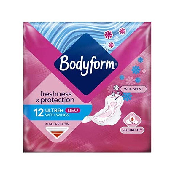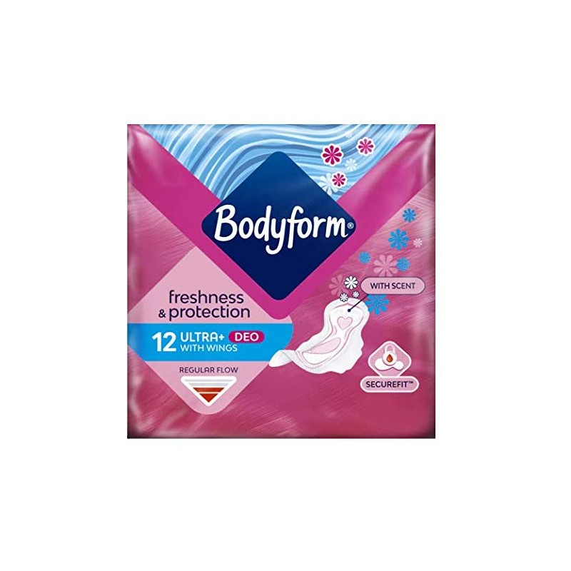 Normal Wing Deodorant Fresh Ultra Towels What do you do with a used towel? Simple. With our new packaging, you can seal your towel neatly and cleanly, no matter when or where. Bodyform mit Roll.Press.Go Wrappers. Protection starts with the right fit. Isn't it great when you find the perfect fit? Our SecureFit towel is uniquely shaped to perfectly hug your curves and stay in place. And it's incredibly comfortable. It offers such great protection, we think you're ready for anything. Fits front and back, specially shaped to fit your body perfectly, heart at the front for easy positioning, DryFast: absorbs quickly for a dry, comfortable feel, all around protection, perforated wing release paper for easy handling, dermatologically tested Bodyform Ultra towels with SecureFit technology and Roll.Press.Go disposal sleeves.