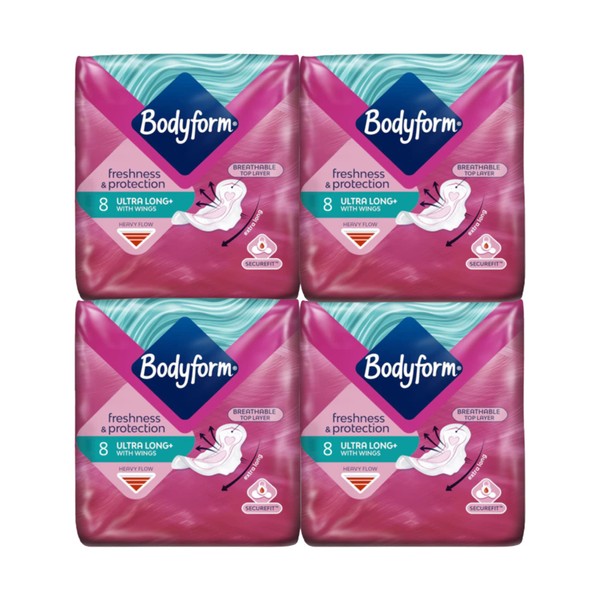 - Package contains: Four packs with 8 Bodyform Sanitary Towels each. Actual packaging may vary.