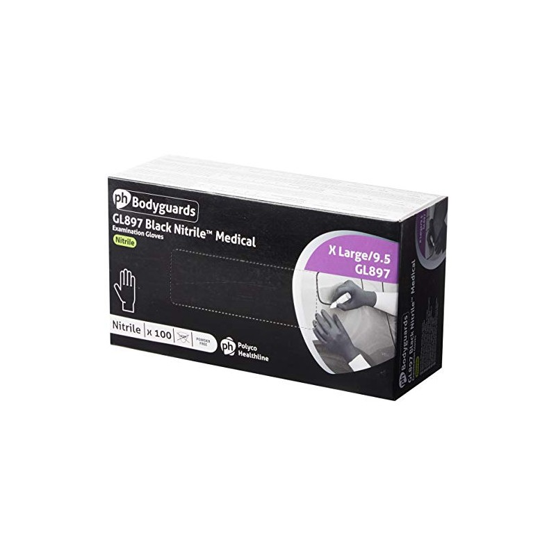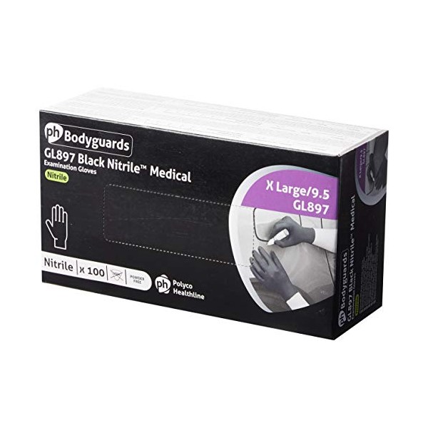 Bodyguard GL8975 Nitrile Disposable Gloves, Powder Free, Size XL, Black, 100 Pieces