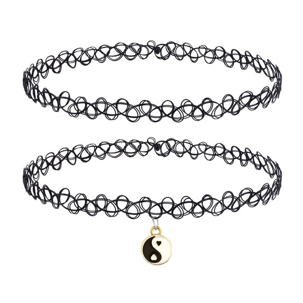 BodyJ4You 2PC Tattoo Choker Necklace - 90s Choker Necklace Women - 2000s Y2K Black Chokers - Yin Yang Goldtone Charm Pendant - Vintage Emo Stretchy Elastic Necklace