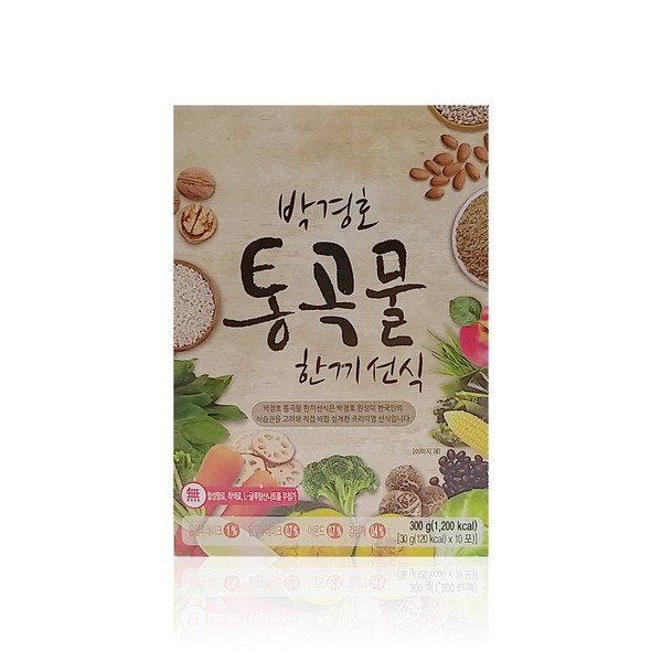- 영양정보: 총 내용량 300 g (30 g x 10포), 1포 (30 g) 당 120kcal 나트륨 40 mg (2 %), 탄수화물 24 g (7 %), 당류 4 g (4 %), 지방 0.9 g (2 %), 트랜스지방 0 g, 포화지방 0.2 g (1 %), 콜레스테롤 2.5 mg (1 %), 단백질 3.8 g (7 %) ※ 1일 영양성분 기준치에 대한 비율(%)은 2,000kcal 기준이므로 개인의 필요 열량에 따라 다를 수 있습니다.