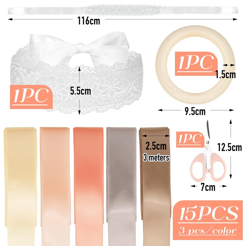 BOFUNX 15pcs Bridal Bouquet Silk Ribbons + Wooden Ring + Lace Blindfold + Scissors, Wedding Bouquet Ribbons Set, Creative Wedding Games for Bride Guests