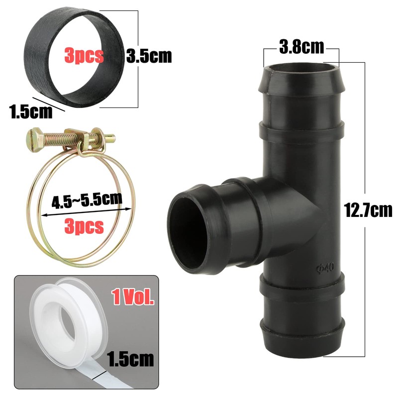 ----Lieferumfang:1 T-Stück + 3 Schlauchschellen + 3 Dichtungen Ringe + 1 Klebeband----Schlauchdurchmesser(Innen durchmesser):38mm----Farbe:Schwarz----Material:PEWenn Sie einige Problem haben, bitte uns jederzeit kontact.