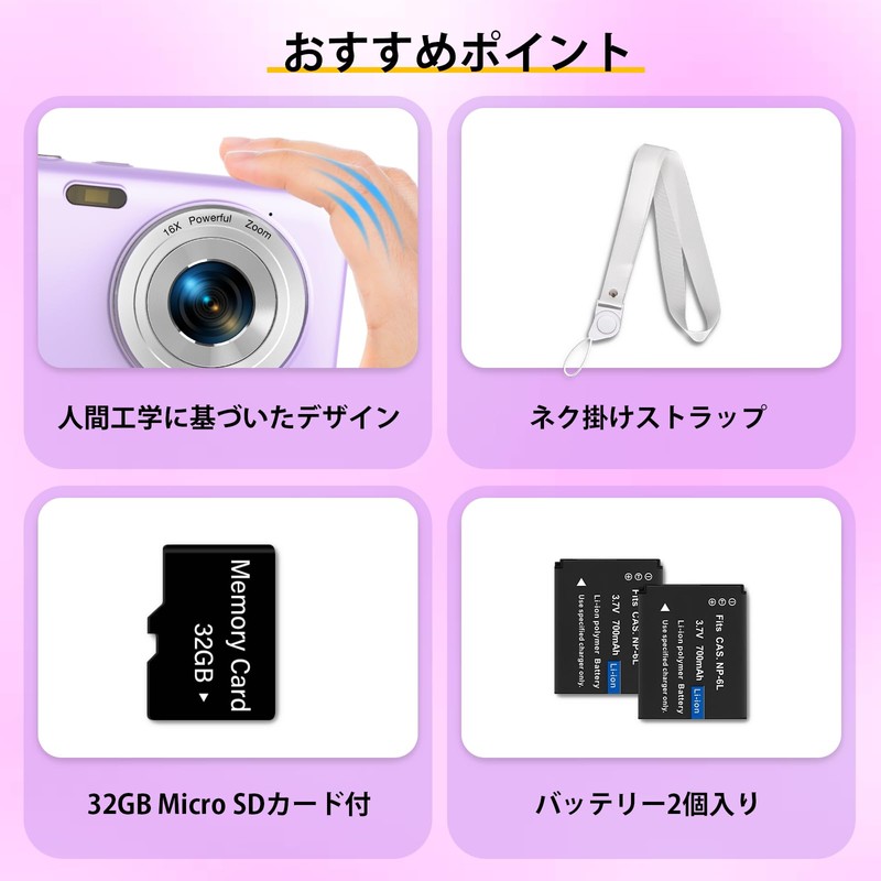 - Convenient to Carry & Package Contents: Lightweight design and small size make it easy to carry your camcorder and capture happy moments anytime, anywhere. This pocket camera is perfect for travel and daily use, very popular for birthday, Christmas, Thanksgiving day, suitable for teenagers, kids, students, boys, girls, record the beautiful Christmas moment for you and your family. Package Includes: 1 x Digital Camera, 1 x Micro SD Card, 2 x Rechargeable Li-ion Batteries, 1 x USB Cable, 1 x User Manual, 1 x Camera Bag, 1 x White Strap, 1 x Strap