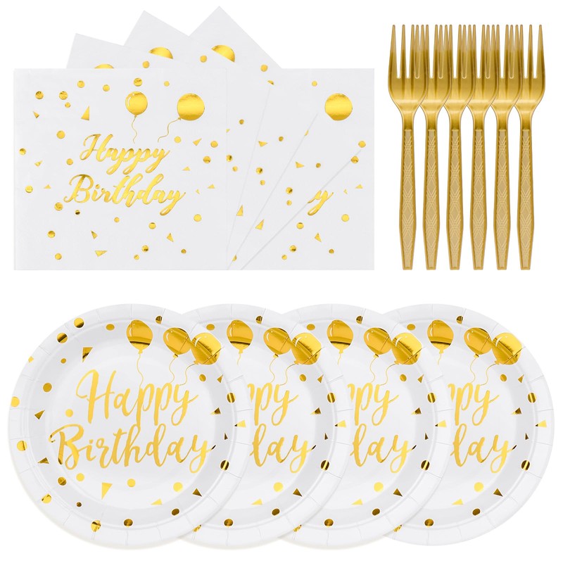 - 75PCS Happy Birthday Paper Plates - 7 Inch White Gold Dot Paper Plates and 6.5 Inch Napkins