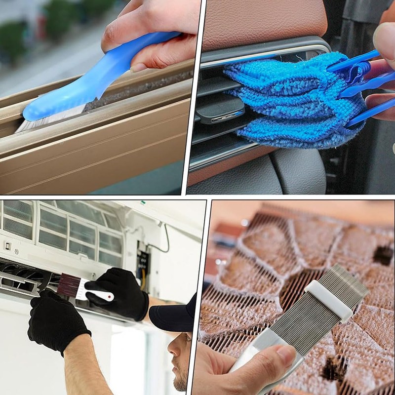 - Air conditioning fin comb set of 5: the dryer brush set is very reasonable and practical. Contains 1 brown brush. 1 metal rib comb. 1 blue folding brush. 1 blue cloth brush. 1 blue cleaning gap brush. Can take care of edges and corners and offers a comprehensive solution for cleaning various devices quickly and effectively.