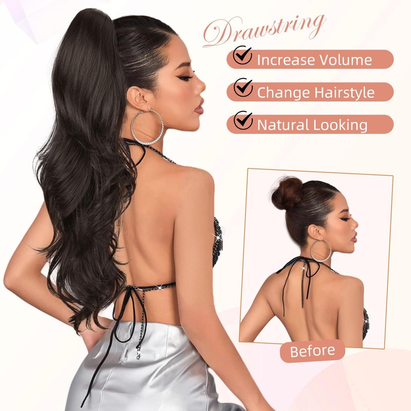 BOGSEA Ponytail Extension 26 Inch Drawstring Ponytail Extension for Women Long Wavy Hair Extensions for Daily Use (Dark Brown)