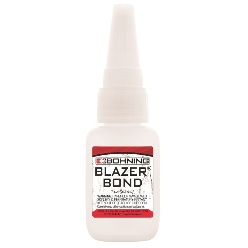Bohning Blazer Bond is an instant glue designed for vanes, feathers and nocks. It works on all shaft types and has a 15 second clamp time, full cure time 2 hours. Use a very thin bead of Blazer Bond for best adhesion. Great for fletching in humid conditions.