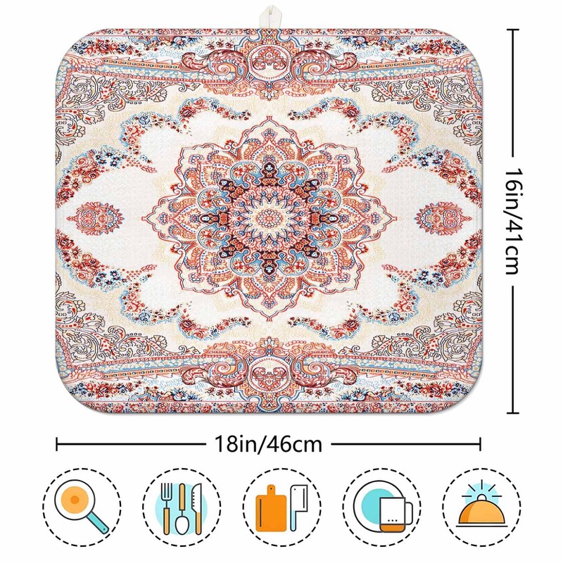 - Size of kitchen drying mat:This kitchen dish drying mat size 16" X 18" x 0.4". Beautiful print on surface side, bright color for cold countertop. The dish mat drying kitchen mat is a nice change from the plain grey or brown mats.