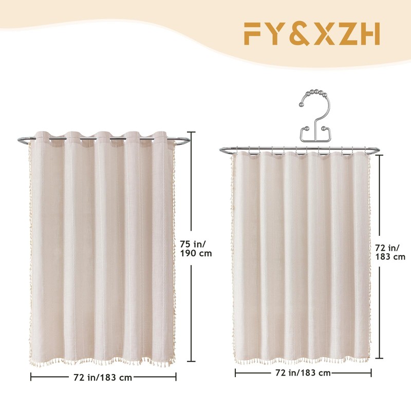 Boho Farmhouse Shower Curtain with Tassel - Striped Polyester Linen Blend Fabric Shower Curtain Set with PEVA Liner,Waterproof Curtain for Bathroom (No Hooks Require, Beige)
