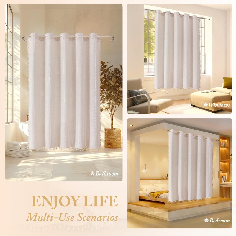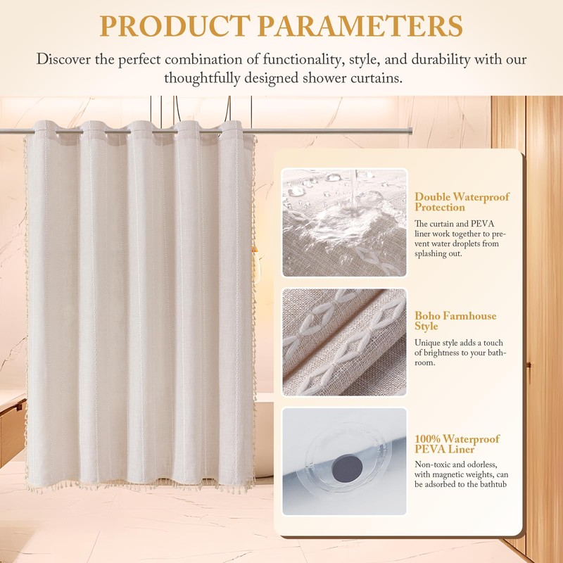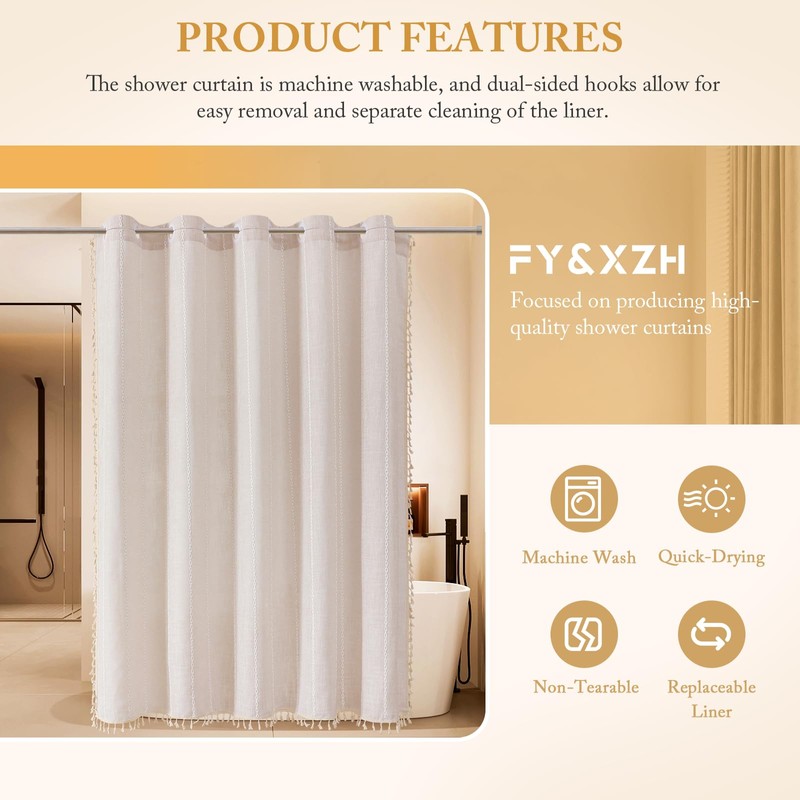 - Boho Farmhouse Style with Tassels: Combining bohemian charm with farmhouse elegance, this shower curtain features delicate 3D embroidered details and tassels along three edges. Its sophisticated yet rustic design adds a touch of luxury to your bathroom, turning it into a stylish retreat. Enjoy spa-like, hotel-inspired comfort right at home.