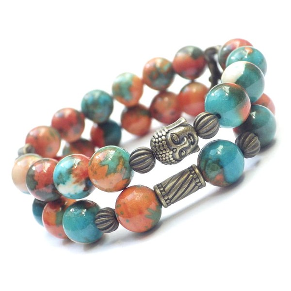 This beautiful ethnic style bracelet is handmade in our workshop in France. Carefully crafted to make it made of dyed brown, orange and blue white jade (semi-precious stone), and beads Tibetan bronze. The Buddha head and an antique look at this jewel Zen, it is important for the holidays and the beach. Type: Bohemian, vintage, ethnic Length: 190 mm Beads: 10 mm Materials: white jade brown, orange and blue (semi-precious stones), antique bronze tinted metal. Colour: brown, orange and blue. Metal colour: antique bronze