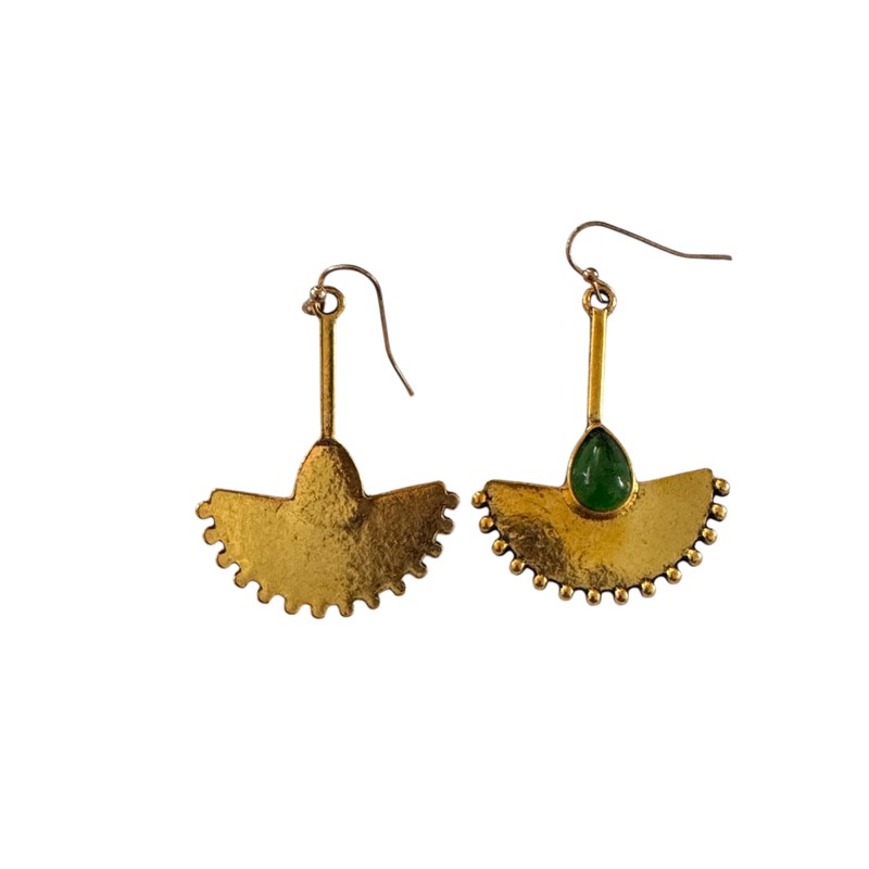Boho Gold Drop Earrings with Green Stone, Handmade Lightweight Dangle