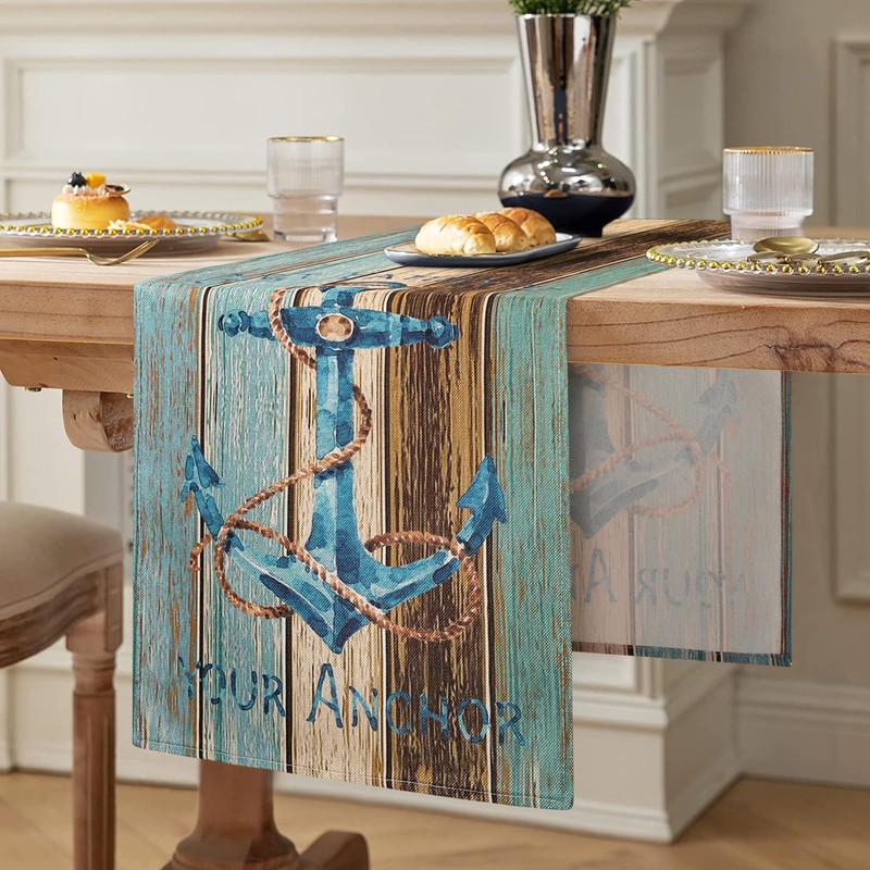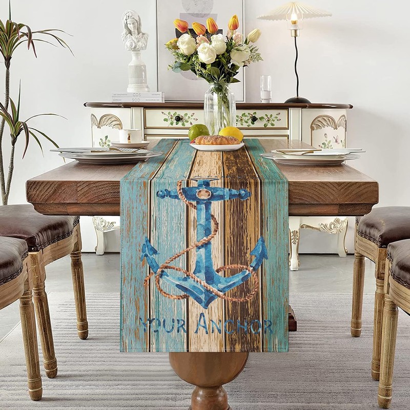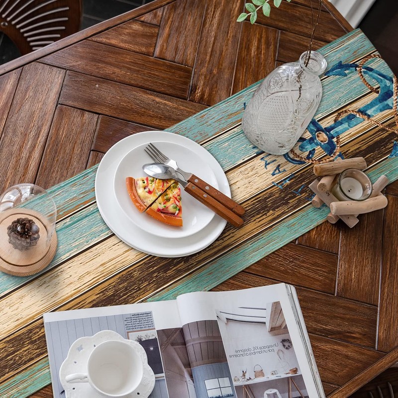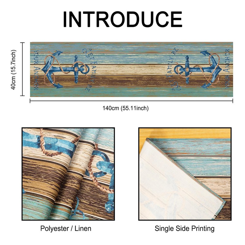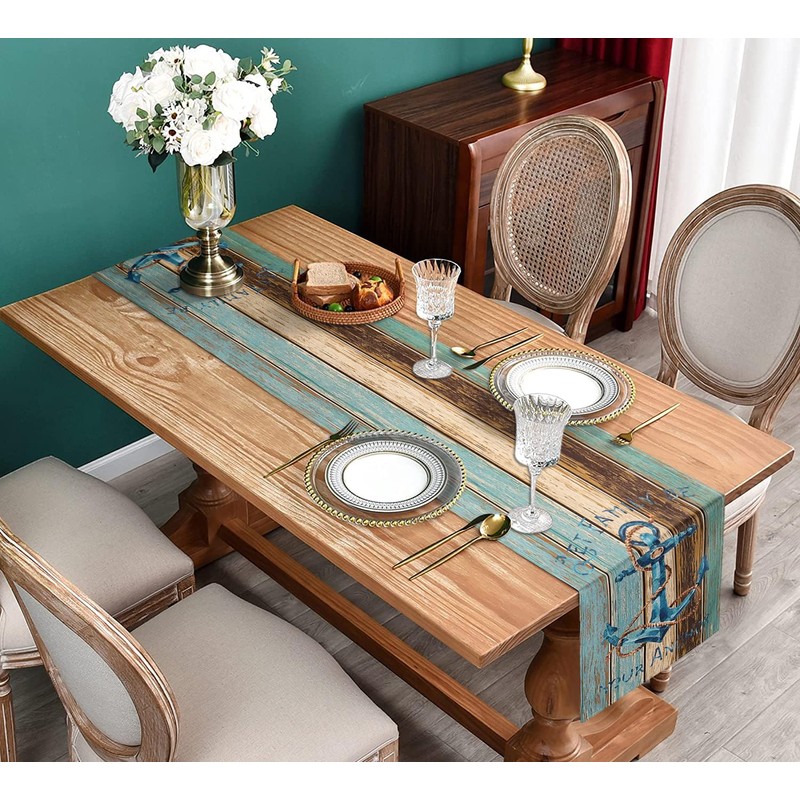 Boho Linen Table Runner Green Blue Grey Planks Barn Teal Runner Ocean Anchor Table Runner Living Room Spring Summer Autumn Winter for Dining Table Party Wedding Kitchen Table 40 x 140 cm