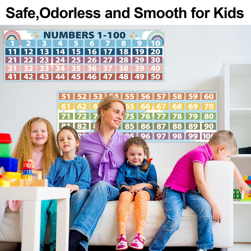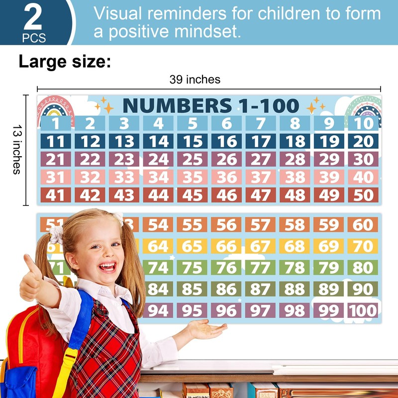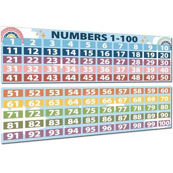 - 【Large size numbers bulletin board】The continuous number line decor from 1 to 100, comes with 2 pieces decoration, each border strip measures about 39” x 13” (99cm x 32cm),Putting up the decor on the wall or blackboard will make the numbers learning and counting become easy, students’ interest and attention will be aroused greatly.The boho rainbow posters providing a fun visual reference and study method for math learners.