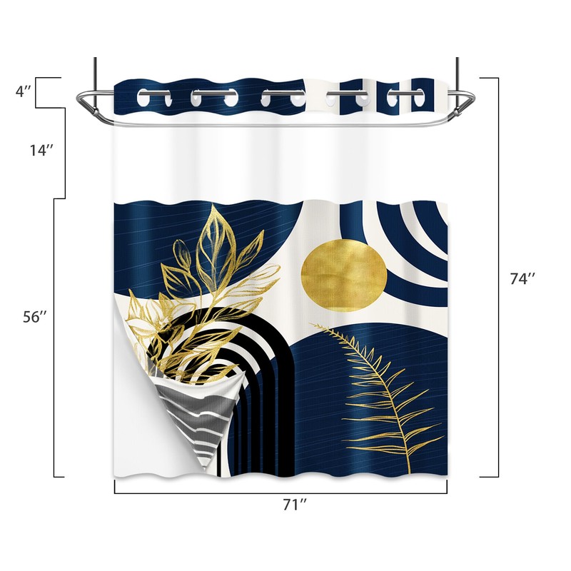 Boho Mid Century Modern Hookless Shower Curtain with Snap in Liner, Navy Blue and Gold No Hook Double Layer Shower Curtains and Liner Set, Waterproof Cloth Fabric, 71" W X 74" L