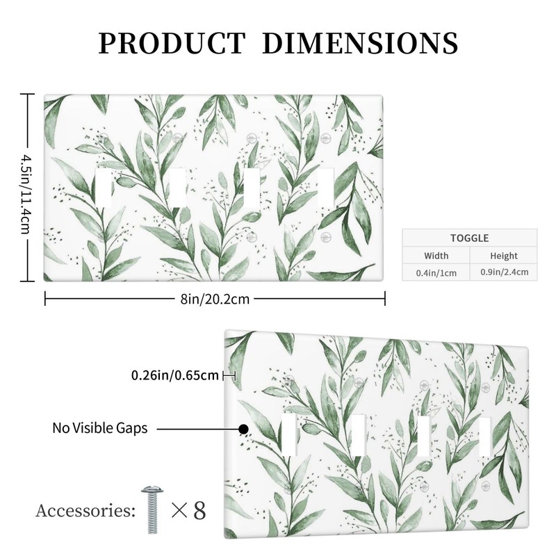 Boho Olive Green Eucalyptus Leaf 4 Gang Device Light Switch Cover Decorative Quad Toggle Wall Plate Decorative Electrical Faceplate Outlet Light Switch Plate