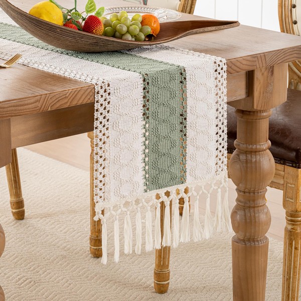 • UNIQUE DESIGN The rustic beige and sage green table runner is made of textured weave and short tassels. The edges of the table runner are carefully stitched, so you don't have to worry about fraying or slightly loose threads. Add a unique country style to your home.