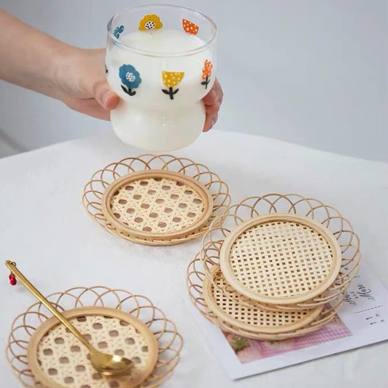 Boho Style, Woven Bamboo Rattan Coasters, Two Patterns, Holes for Drinks Coas...