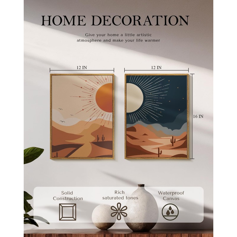 - Two-piece set with a coordinated sun and moon theme: This set includes two framed prints, each measuring 12x16 inches, depicting desert scenes — one in sunlight and the other under the moon and stars. Together, they create a calming visual narrative of balance and transition, making them perfect for interiors with a day-to-night theme.