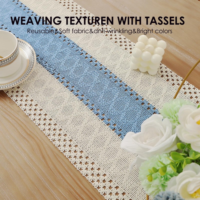 Boho Table Runner 48 Inches Long for Fall Home Decor Farmhouse Rustic Table Runner Blue Macrame Table Decoration with Tassels Made of Cotton Linen for Spring Living Room Bridal Shower (12x48)
