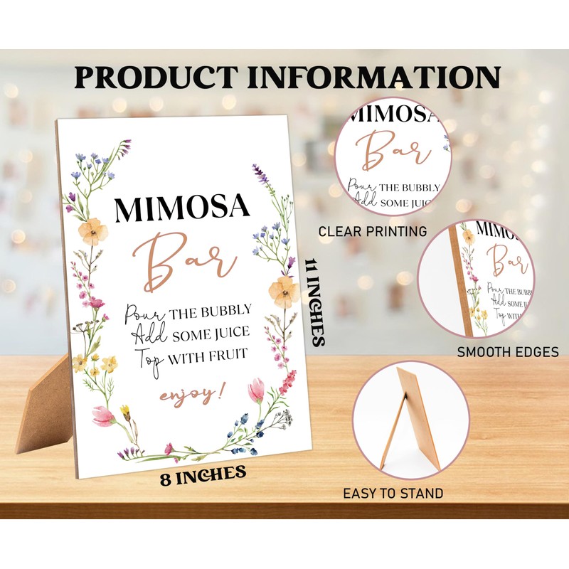 - Package Include: You will receive an 8" x 11" wooden tabletop mimosa bar sign with stand to suit your bridal shower needs.