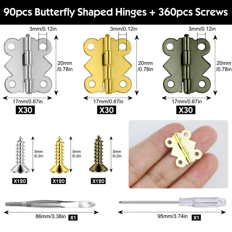 Bohoray Pack of 90 Small Folding Hinges Butterfly Shape Mini Hinge 20 x 17 mm, 3 Colours Metal Hinges Small with 360 Screws, 1 Screwdriver for Jewellery Box Cabinet Wooden Box DIY