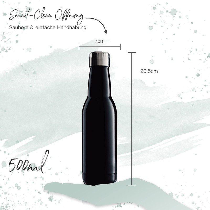 - Design - Our insulated drinking bottle is an absolute eye-catcher with its colours and look. The bottle is approx. 26.5 cm high and approx. 6.7 cm wide. It is available in various colours. Thanks to its screw cap, it is leak-proof. The thermal bottle is easy to clean, but not dishwasher safe.