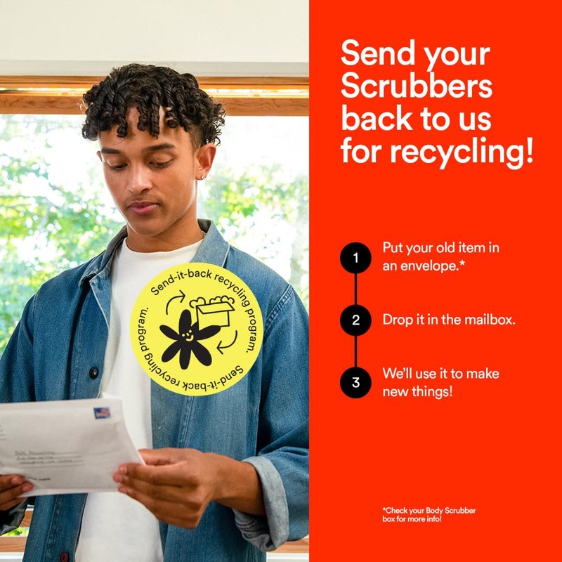 • Duradero y de larga duración: ¡No tendrás que tirarlo cada mes como con un puf de lufa! Hecho de material reciclable de alta calidad con tacto similar a la silicona, este exfoliante corporal es una alternativa a la lufa que dura hasta 6 meses. Además, puedes devolverlo para su reciclaje. Es fácil de limpiar, de secado rápido y reciclable a través de nuestro programa de devolución, a diferencia de los pufs de lufa.