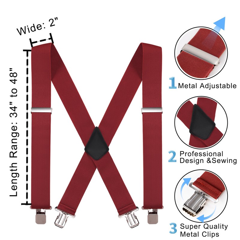 - EXQUISITE DESIGN - Our Suspenders for men are 2 inches wide and adjustable in length from 34 to 48 inches. They perfectly fit your body, and the elastic material ensures comfortable wear without restriction