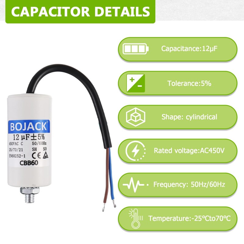- 【Features】Capacity: 12µF Operating Voltage: 450 Volts. Cable model: M8, cable length: 150 mm