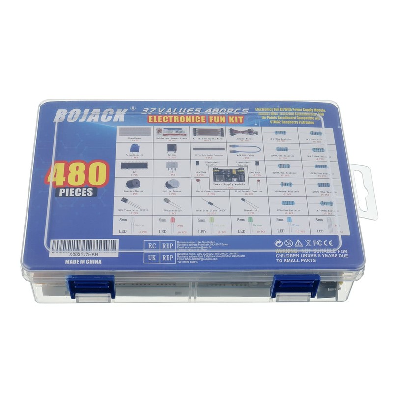 BOJACK BOJACK 37 Values 480 Pcs Electronics Component Fun Kit with Power Supply Module, Jumper Wire,Precision Potentiometer,830 tie-Points Breadboard Compatible with STM32,Raspberry Pi,Arduino