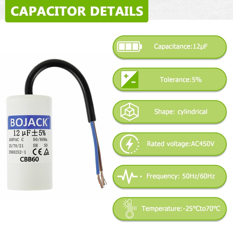 BOJACK CBB60 12uF 450V 50/60HZ Starting Capacitor, SH Motor Operating Capacitor, AC Motor Capacitor, with Wire