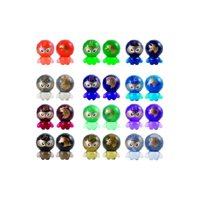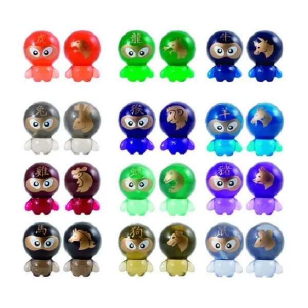 These were sold in vending Machines featuring little figure with Chinese character in front and zodiac sign in back of head. You can all 12 figures, one of each (the picture shows 24 because it shows the front and back of each figure)