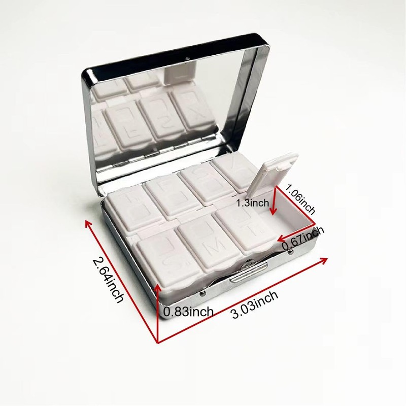 - The pill organizer inside has 8 separate compartments (comes in white only) individually separated with plastic covers to open individually. The cover has a mirror on the inside cover. The size of the box is approximately 3 inches by 2 1/2 inches by 1 inch deep.