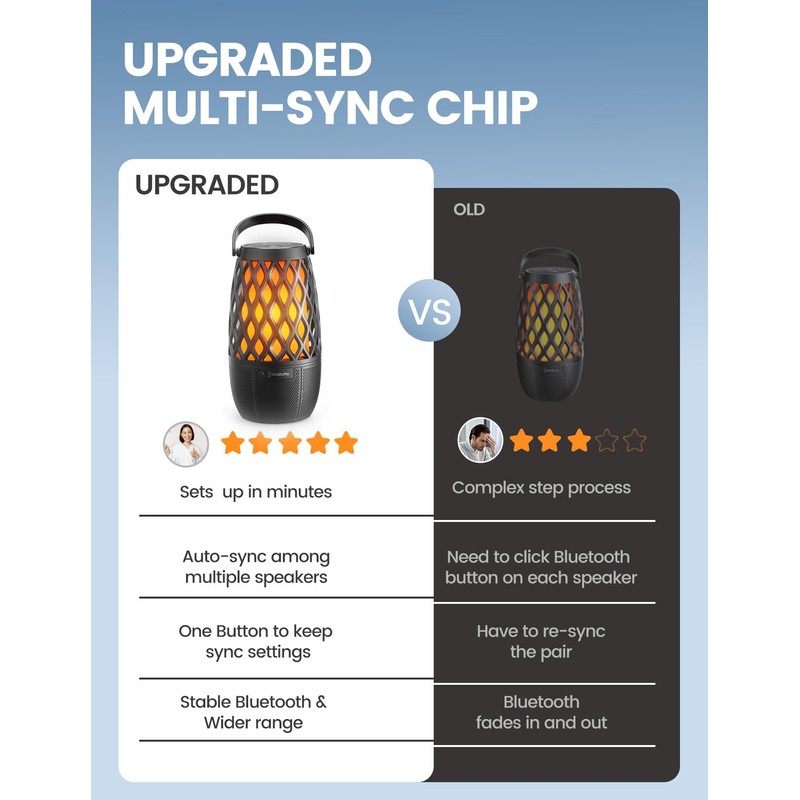 - Astonishing Surround Sound - Bluetooth 5.0 and its built-in DSP technology ensure a well-balanced sound experience with great clarity. Need more vibes and space-filling sound for parties or outdoor events? You can pair up to 100 flickering flame Bluetooth speakers together and synchronize music playback across them to get a more immersive and 360° surround sound experience