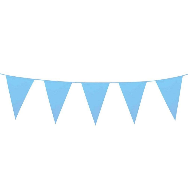 - It has a length of 10 m and is made of plastic. The pennants are plain in light blue