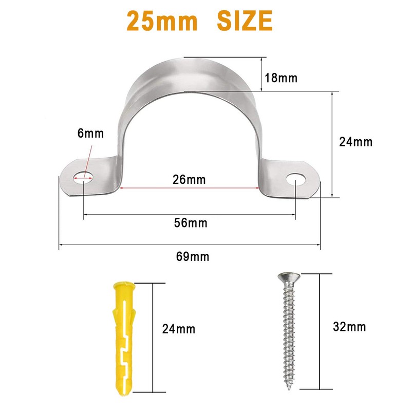 - Size: fits 25 mm pipe diameter, diameter of the mounting hole: 6 mm, width: 18 mm, thickness: 0.6 mm.