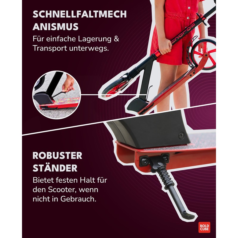 - FAST FOLD – The fast folding scooter lever offers quick and simple opening and closing of the kids scooter. Simply pull the lever down and your big two wheel scooter will fold / unfold. When you’re ready to store the scooter away the handlebars also fold down for more compact carry or storage size.