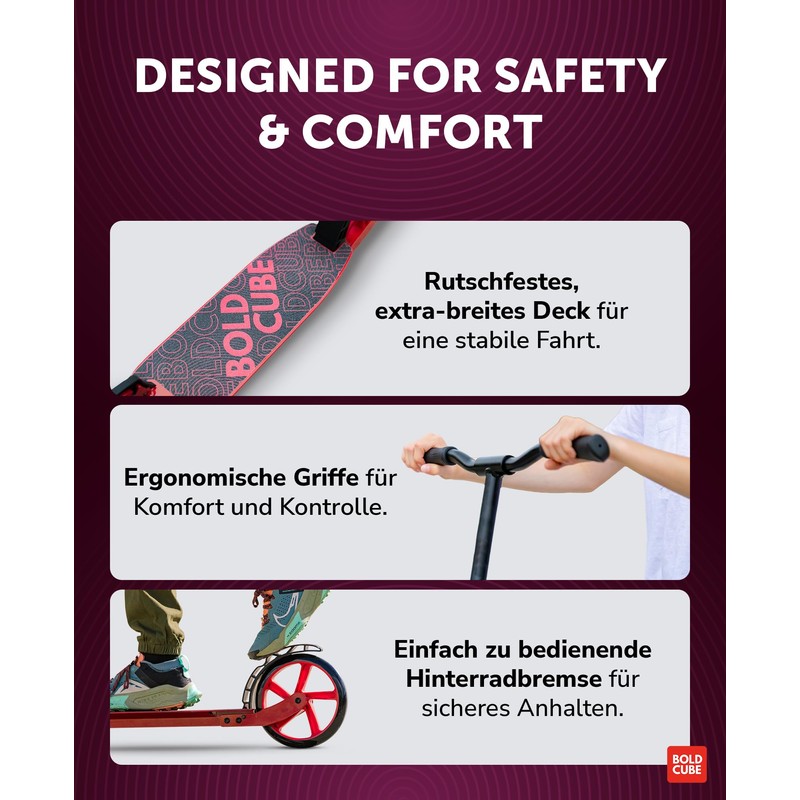 - FRONT WHEEL SHOCK ABSORPTION - With suspension fitted in the front wheel taking on uneven and bumpy surfaces couldn’t be more comfortable. Your BOLDCUBE children's and teen scooter's suspension absorbs as much of the shock as possible to minimise riding vibration.