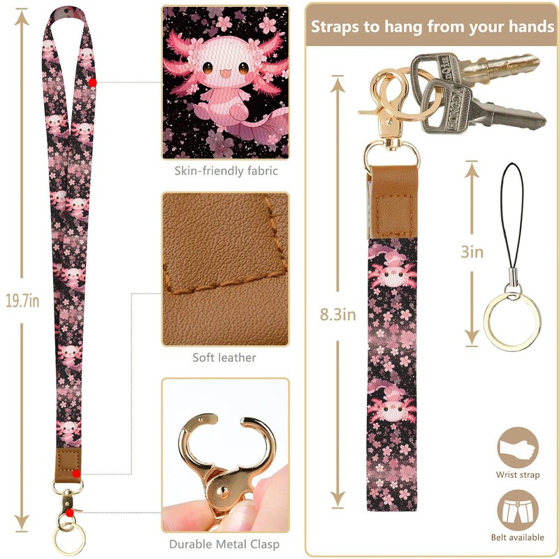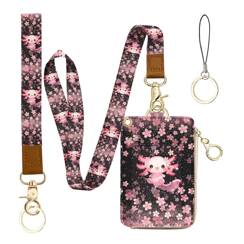 bolimoss Axolot ID Badge Holder & Lanyard Wallet 2-in-1Cute Sakura Womens Small Wallet with Removable Wristlet & Neck Lanyard, Clear Window, 5 Card Slots, Side Zipper Pocket, Ring Keychain