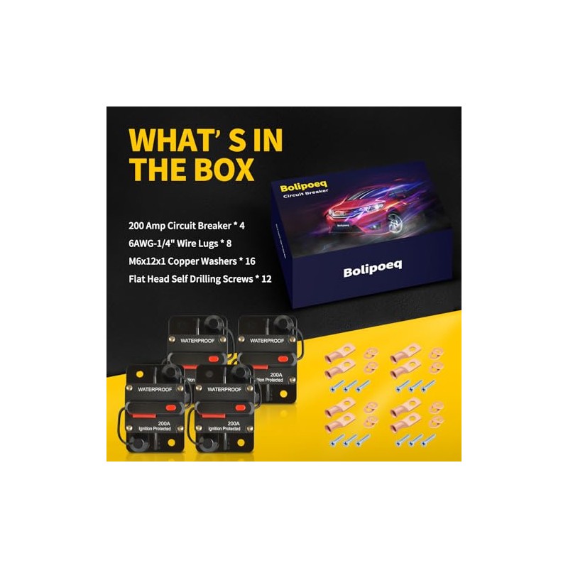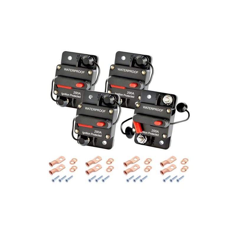 - Easy Surface-Mount: Bolipoeq 12v dc circuit breaker is surface-mount design, simply mount them on panel or firewall, hassle-free installation. What you get: 4 x auto 200 amp Breaker, 8 x Wire Lugs, 16 x Washers, 12 x Mounting Screws.